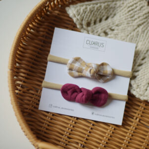 €12.00 Į krepšelįGalvajuosčių rinkinys kūdikiui, mergaitei su nailono juostele. Nailoninė juostelė nespaudžia, neslysta, tinkama dėvėti nuo pat gimimo. Kaspinėliai pasiūti iš organinės medvilnės muslino.