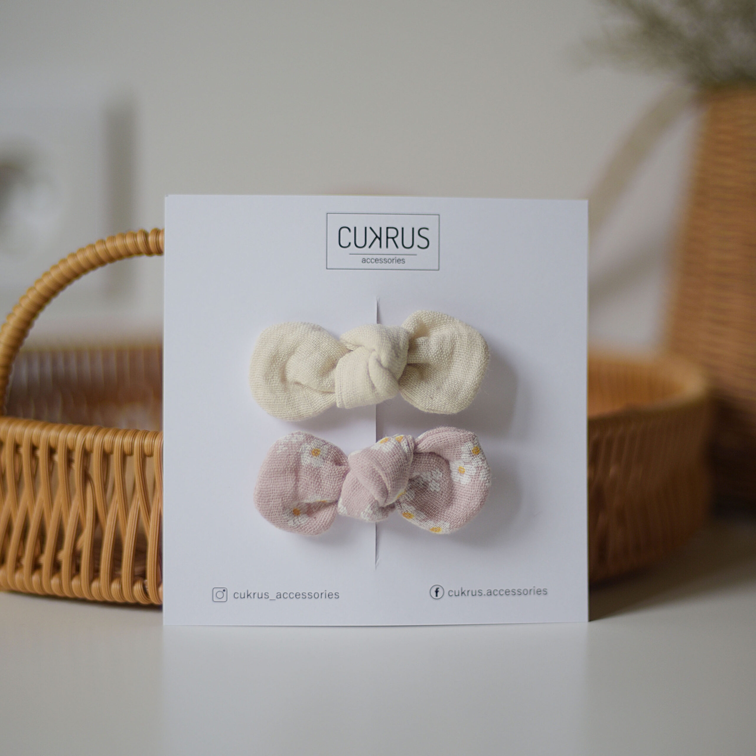 Dviejų segtukų rinkinys: pieno balta, švelniai rausvas su gėlėmis. Kaspinėlio dydis: 6cm x 3cm